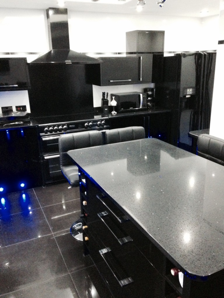 The white on black contrast is highly effective and blue accent lighting completes the effect. The black Starlight Quartz worktops add to the high quality feel.
