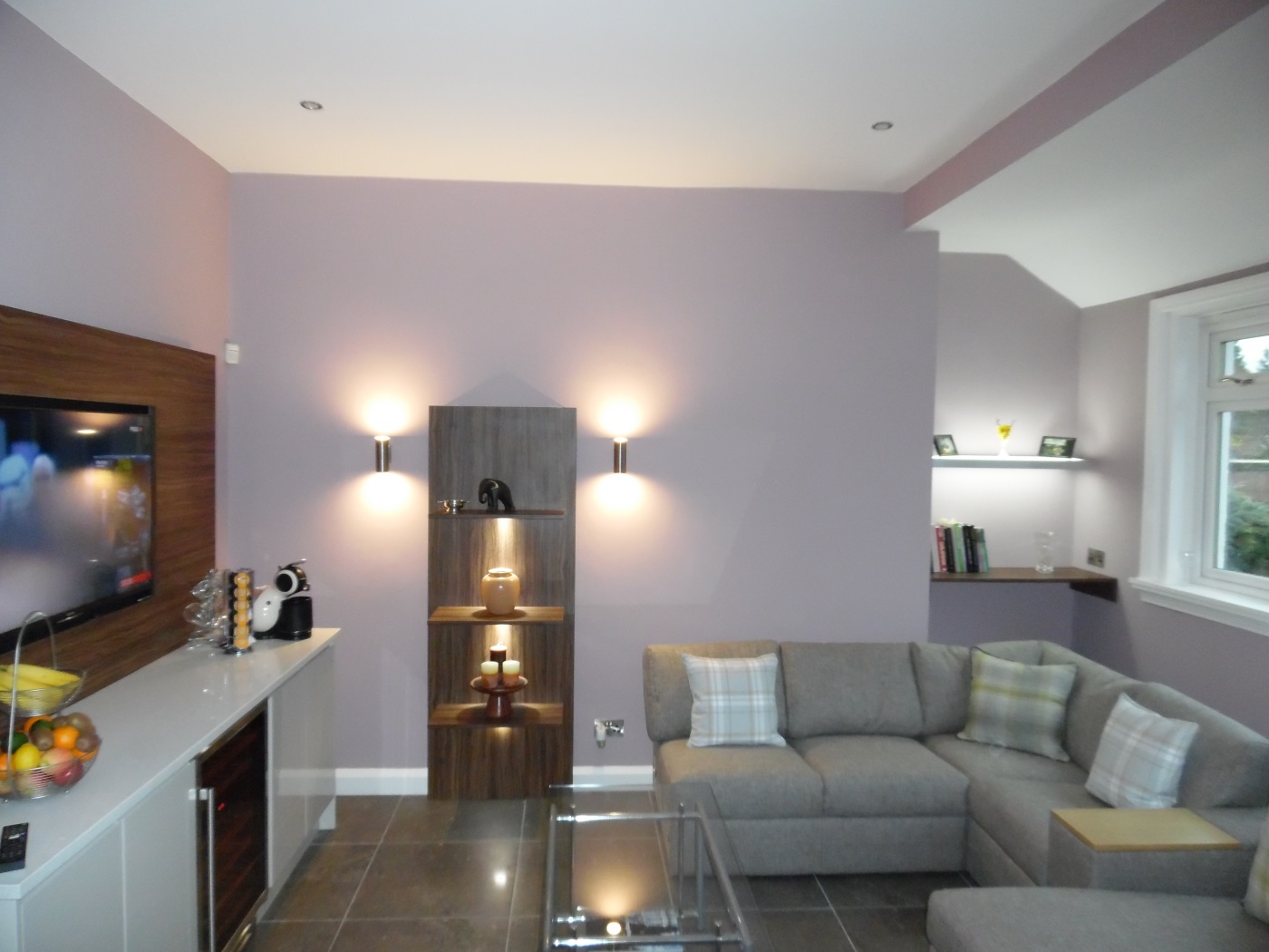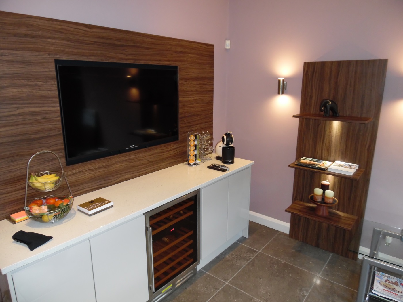 Olive wood panelling was used in this area to provide a warm contrast in the room. David created a fantastic shelving unit between the sofa and TV to display decorative items and we also ‘Flush Fitted’ the TV in to the Olive wood so no wires were visible.