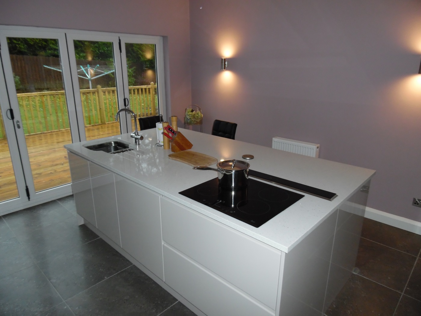 In the Island we used an induction hob with a modern downdraught extractor that would vent to the outside wall. We used a white starlight quartz worktop because the mirror chips would reflect and enhance the light coming from the bi-fold doors. An instant hot water tap was also used to eliminate the need for a kettle on the Island.