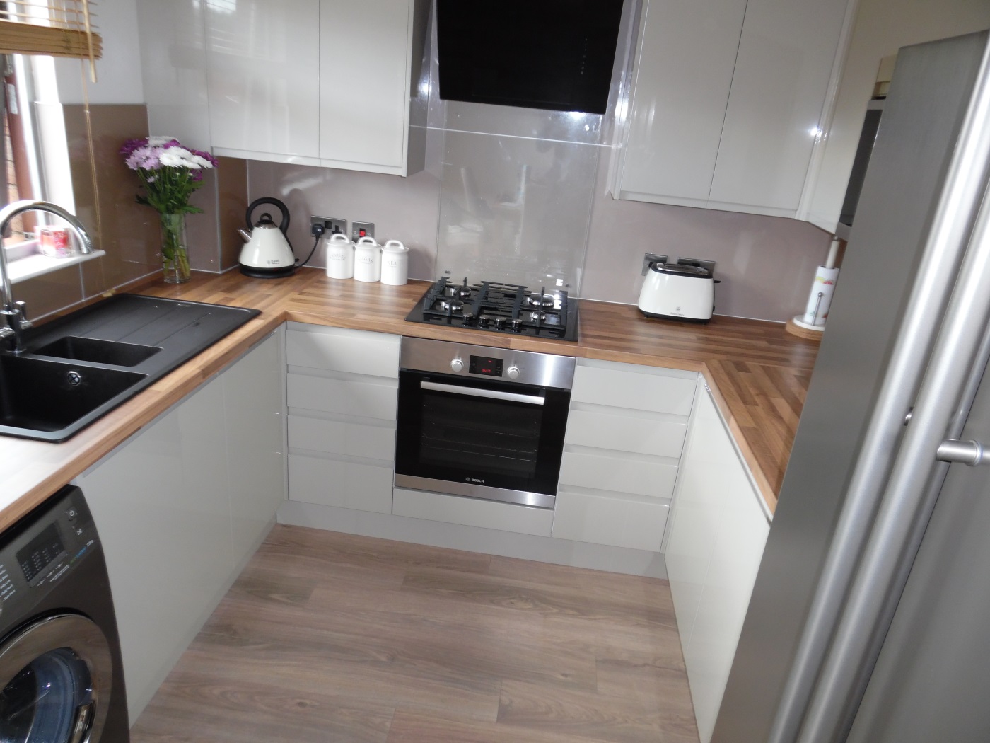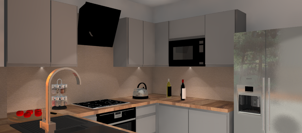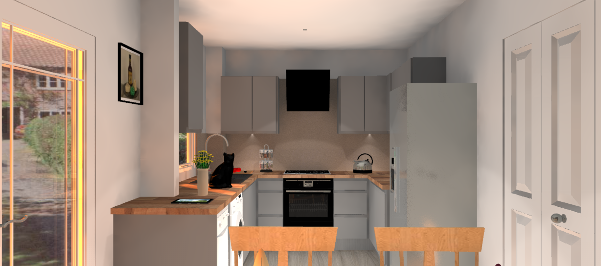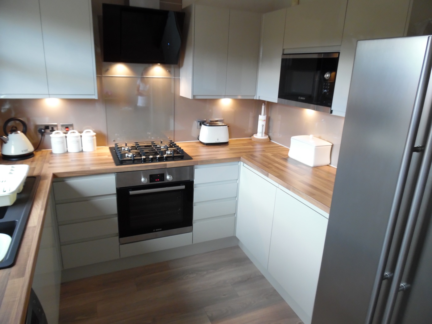 Our client was looking for a fresh modern look for her new kitchen. We wanted to use warm natural tones to blend in with the existing decoration. During the design process we wanted to maximise the storage in the kitchen so we decided to return the units back to the fridge freezer and centre a microwave in the wall units. This would be a great space to prepare food and LED lighting was provided under the wall units to create an ambient setting at night.