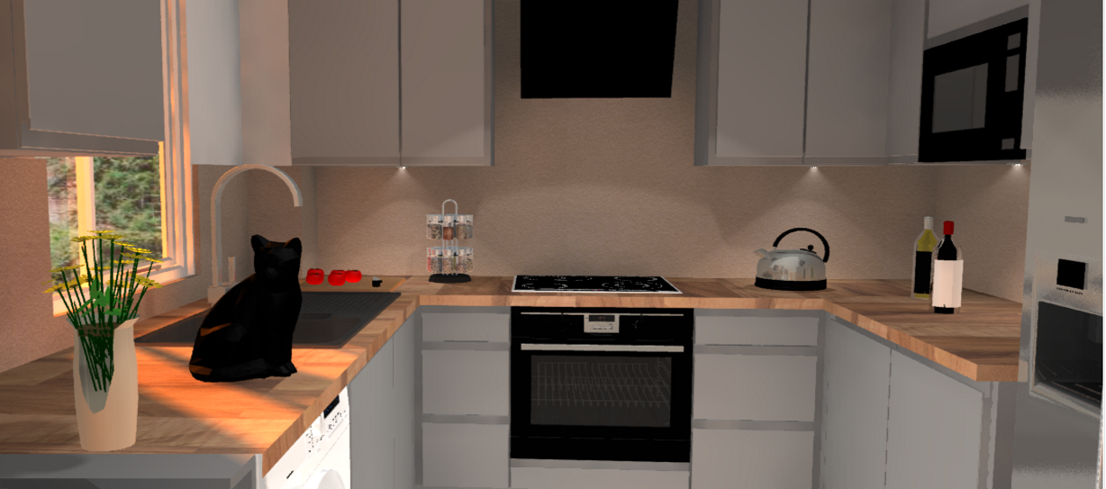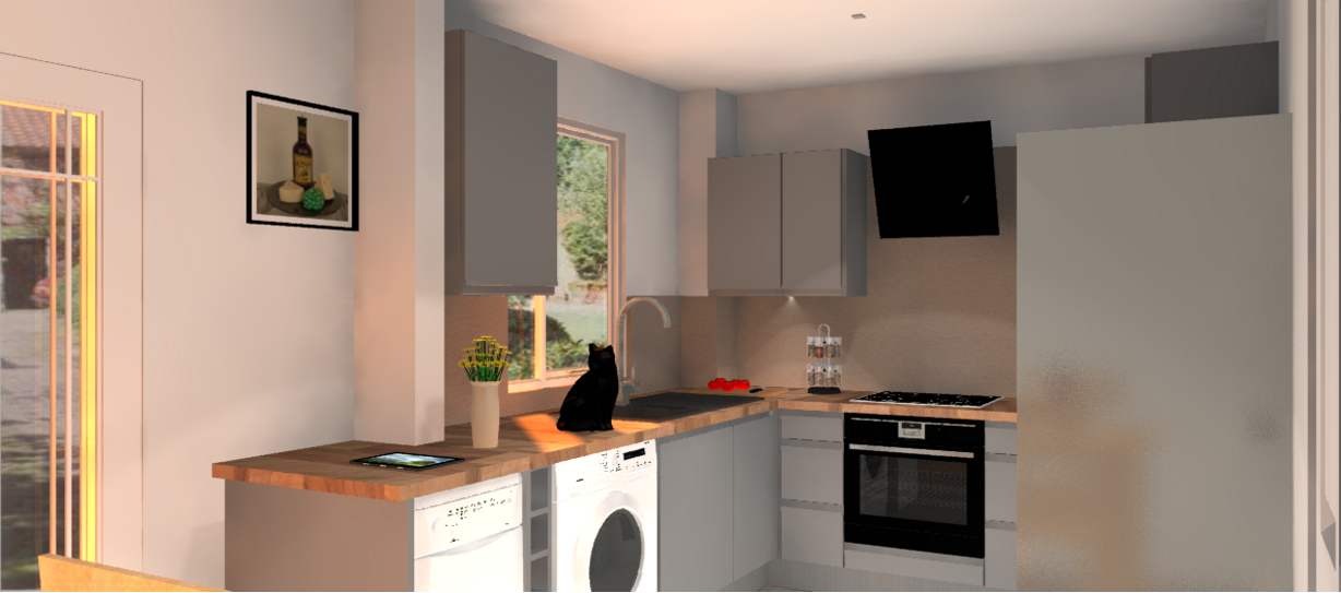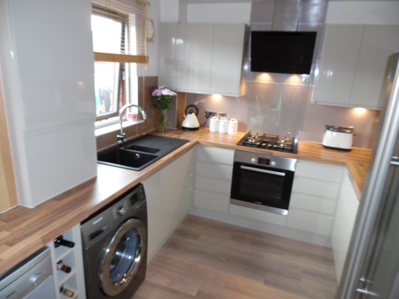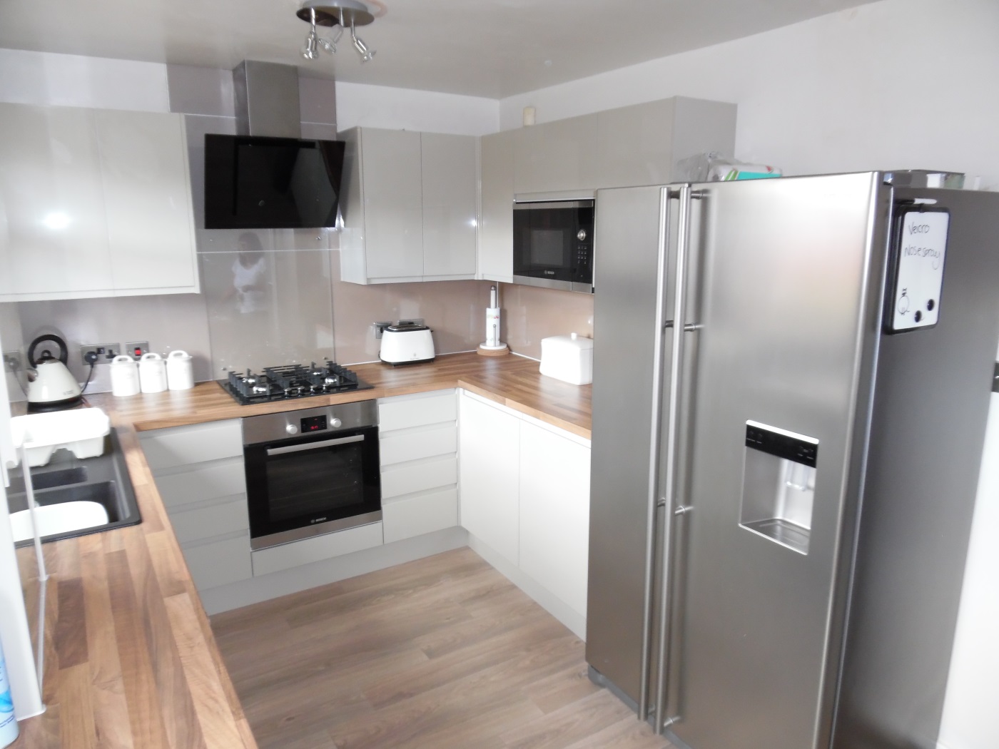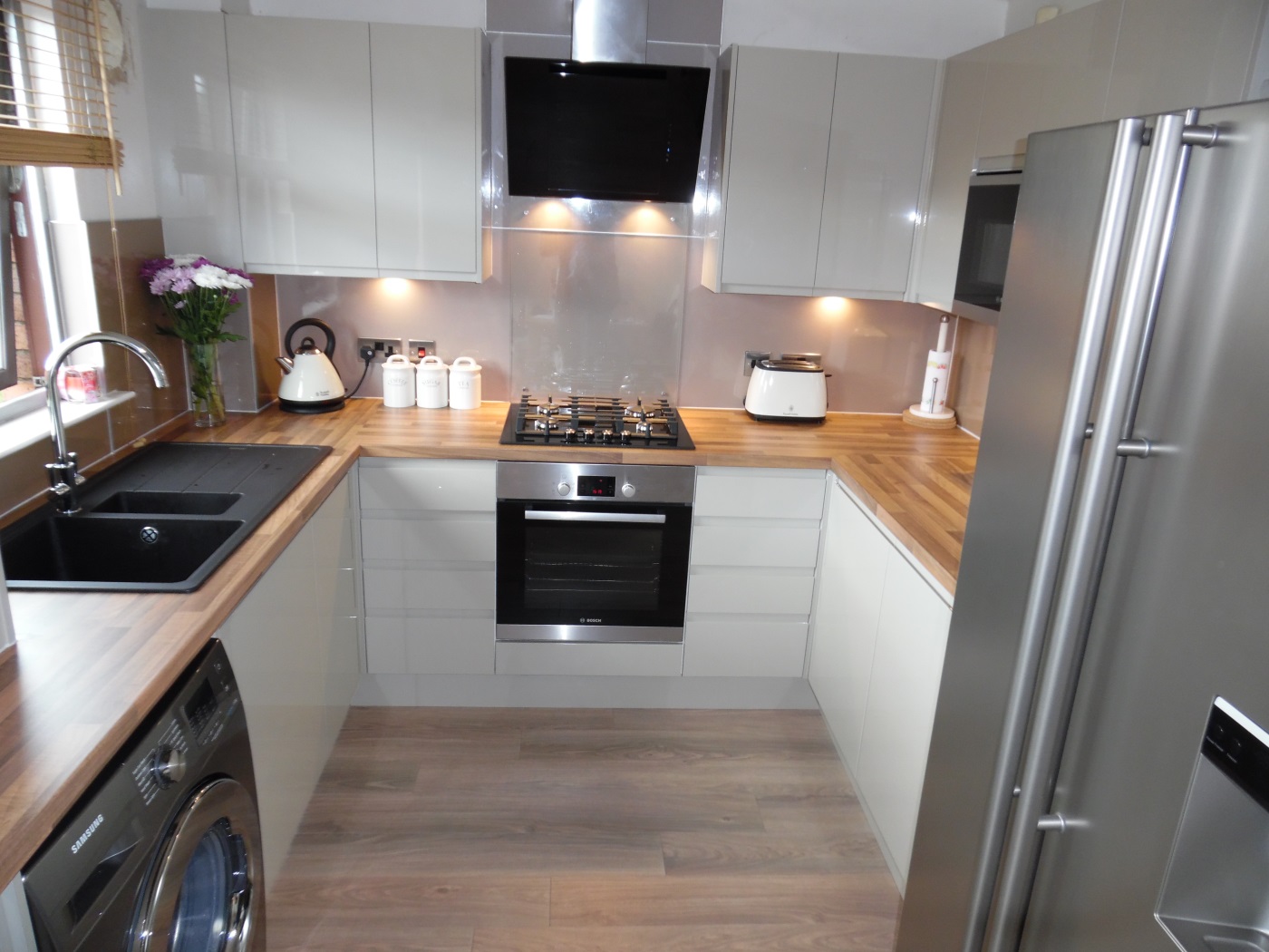 Our client was looking for a fresh modern look for her new kitchen. We wanted to use warm natural tones to blend in with the existing decoration. During the design process we wanted to maximise the storage in the kitchen so we decided to return the units back to the fridge freezer and centre a microwave in the wall units. This would be a great space to prepare food and LED lighting was provided under the wall units to create an ambient setting at night.